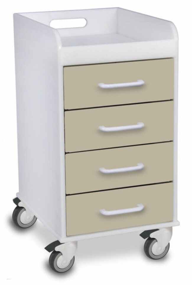 TrippNT's Almond Beige Polyethylene Compact 4 Drawer Locking Cart at 27 inches tall fits under most counters, tables, desks and benches. Push-pull handle is built in for easy mobility. Drawers are 3 inches deep. 14 x 27 x 19 in. WHD; 49 lbs