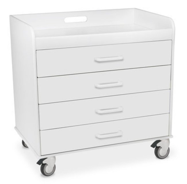 TrippNT's White Polyethylene Extra Wide Compact Locking 4 Drawer Cart has 4 locking drawers and at 27 inches fits under most counters, tables, desks and benches. Push-pull handle is built in for easy mobility. Drawers are 3 inches deep. 27 x 27 x 19" WHD