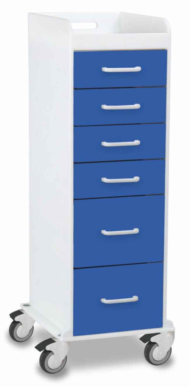 TrippNT's Global Blue Polyethylene Tall Locking 6 Drawer Cart has full extension drawers and heavy duty casters with brakes. It features four 3 inch deep drawers and two 9 inch deep drawers. The top is a 3 inch deep tray.