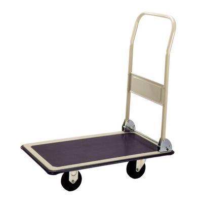 Folding Handle Truck^ Made of stainless steel. Enameled finish with non-skid heavy vinyl deck surface. Platform size: 88.9Lx58.4Wcm. 12.7cm casters. Protective vinyl perimeter bumpers. Capacity: 272kg.