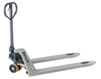 Deluxe Lowboy Pallet Truck^ 15.2cm moldon polyurethane steering wheel. Fork: 121.9Lx69Wcm. Capacity: 2494kg. 5.1cm steel load wheels. 15.9cm raised height.