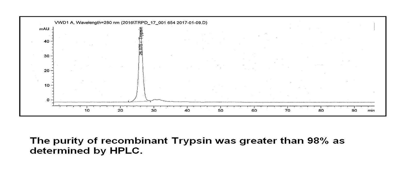 Trypsin, Recombinant 10mg^ Trypsin, Recombinant, Source Pichia pastoris, Species: Human, Biological Activity Specific activity is > 3800 USP Units/mg, Synonyms: Beta-trypsin, Cationic trypsinogen, Serine protease 1, Trypsin I, PRSS1, TRP1, TRY1, TRYP1, Size: 10mg