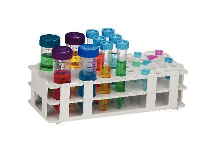 Tube Rack^ Holds four 50ml, six 15ml and twenty-five 1.5ml tubes in three different hole sizes (30.2mm, 17.3mm and 11.4mm respectively). Dimensions are 246x104x64mm high. Polypropylene racks are submersible and steam autoclavable to 121[degree]C.