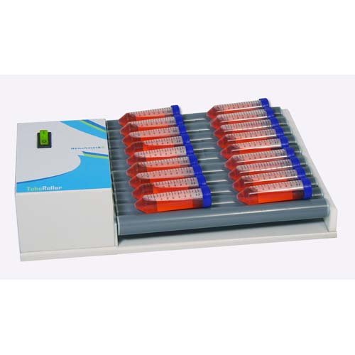 Benchmark TubeRollers are designed for the gentle, throrough mixing of a variety of containers, including Vacutainers, bottles, test tubes, centrifuge tubes and roller botles. Both models (5 roller and 10 roller) operate at a constant 38rpm, chosen as the optimum speed for the broadest range of mixing requirements. As the roller mechanism rotates through each complete revolution, the right side of each roller is gently elevated about 0.5 in (13mm) and returns to the horizontal starting position. This additional, gentle up/down motion provides a "wave" effect and guarantees that the entire sample is subjected to complete, thorough mixing, end to end. This built in tilt feature provides a level of homogeneous mixing uniformity that can not be matched by any stationary roller apparatus.