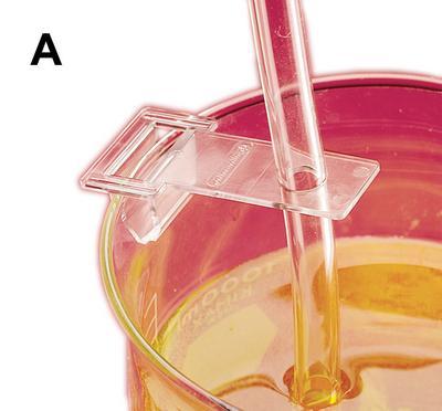 Tubing Holder^ Polypropylene clip captures and holds flexible tubing firmly in place in beakers or other open containers. Fits snugly over the edge and has a 51mm (2in) long arm with a hole to accept tubing up to 9.5mm (3/8in) O.D. Autoclavable. 6 per bag.