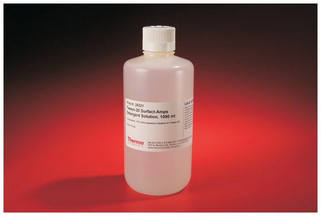 Thermo Scientific™ Tween-20 Detergent Surfact-Amps Solution is highly-purified Tween-20 detergent stabilized and supplied as a 10% solution in 10mL glass ampules.This is an easy-to-use 10% (w/v) solution of purified Tween-20 detergent for use in routine and high-demand protein research methods and molecular biology techniques. Tween-20 is a nonionic polyoxyethylene surfactant that is most frequently added to PBS or TBS wash buffers for ELISA, Western blotting and other immunoassay methods.Surfact-Amps™ Detergent Solutions (10% w/v) provide unsurpassed purity, quality and stability. Unlike neat detergents, which are extremely viscous, Surfact-Amps 10% Solutions are easy to pipette and accurately dispense. The surfactant solutions are carefully prepared and packaged under nitrogen in glass ampules, ensuring their stability and eliminating the accumulation of peroxides and degradation products.Highlights:Tween 20 – a popular nonionic detergent for use in immunoassay wash buffersAccurate – precise 10% detergent solution in ultrapure waterEasy-to-use – solution is simple to dispense and dilute for useExceptionally pure – less than 1.0μeq/ml peroxides and carbonylsStable – packed in glass ampules under inert nitrogen gasDetergent Properties:Molecular Weight: 1228Detergent Class: NonionicAggregation Number: UnknownMicelle Molecular Weight: UnknownCritical Micelle Concentration (CMC): 0.06mM (0.0074%, w/v)Cloud Point: 95°CDialyzable: No