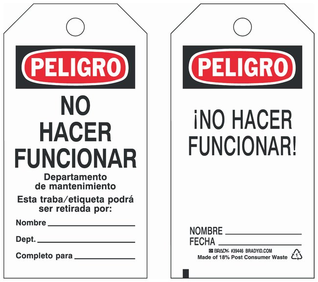 Two-Sided Polyester Tag: PELIGRO NO HACER FUNCIONAR DEPARTAMENTO DE MANTENIMIENTO…, Pack of 25