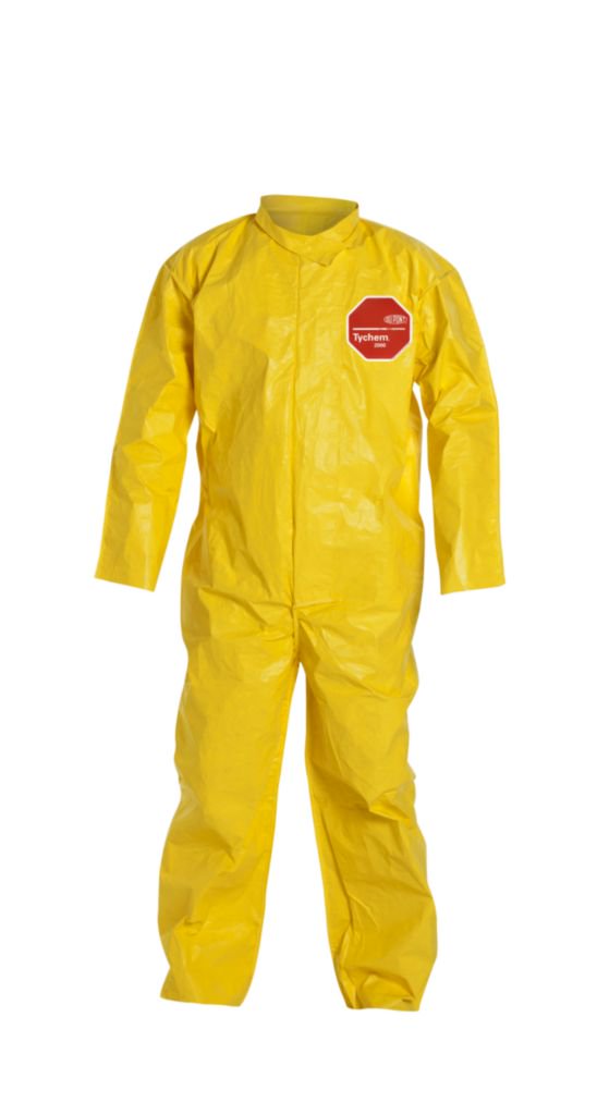 DuPont* Tychem* QC Coverall^ Made of polyethylene-coated Tyvek* fabric. Provides light liquid splash protection against a wide range of industrial hazards. Lightweight, durable coverall features bound seams, collar, and front zipper closure. Color: Yellow. Size: 4X-Large.