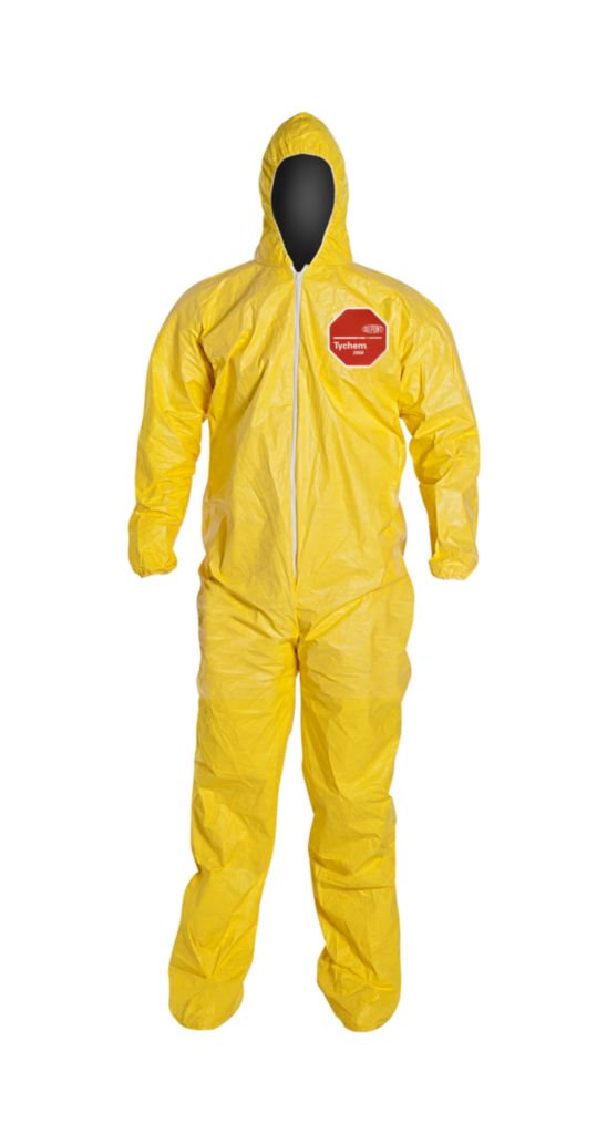 DuPont* Tychem* QC Coverall^ Made of polyethylene-coated Tyvek* fabric. Provides light liquid splash protection against a wide range of industrial hazards. Lightweight, durable coverall features serged seams, attached hood and boots, elastic wrists, and front zipper closure. Yellow. Size: 4X-Large.