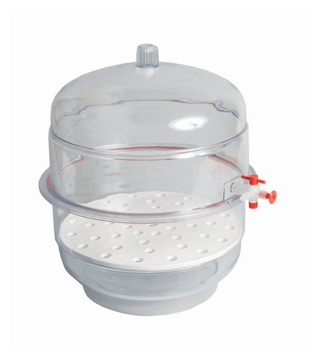 Can hold vacuum up to 740mmHg for 24 hours without any greasingAutoclavable at 120°C for 15 minutesTop dome, molded in rigid and transparent PC, gives crystal-clear view of sampleKnurled knob on top provides easy handling of domeTransparent PC bottom provides increased viewing clarityInternal groove on flange holds silicon rubber O-ringPP stopcock has self-lubricating PTFE plugThree-way plug opens to create vacuum, closes to hold vacuum, and opens again to release vacuum