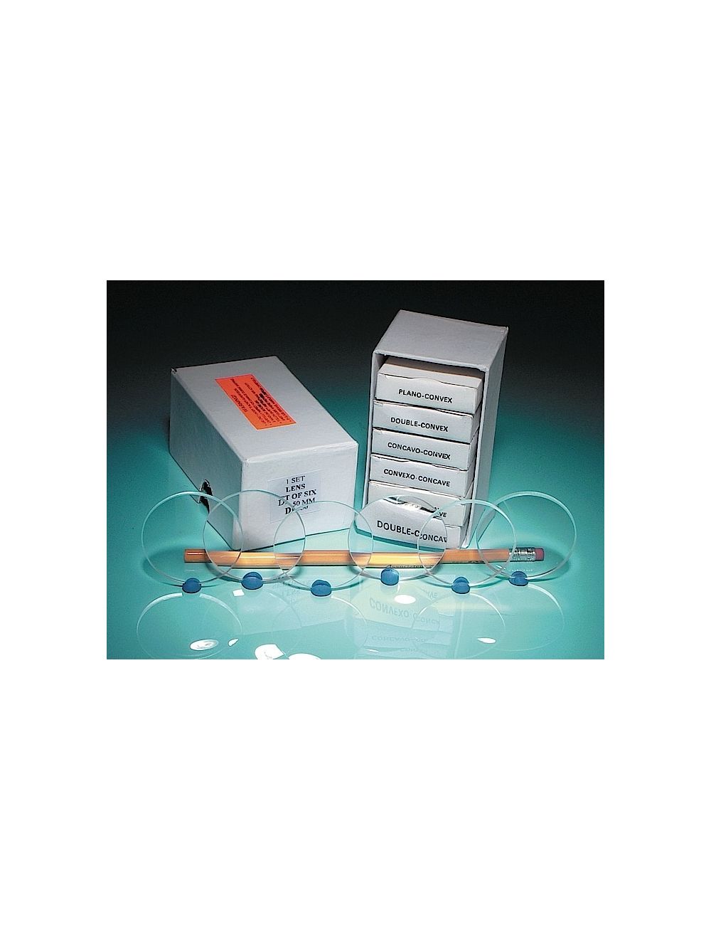 The set contains 6 lenses, one each of double convex, plano-convex, concavo-convex, double concave, plano-concave, and convexo-concave lens. Comes in a reusable cardboard storage box.