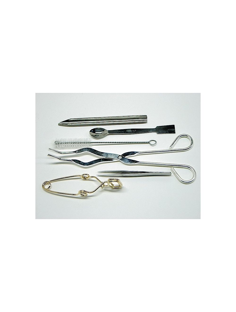 An assortment of six of the most commonly used laboratory tools, available as one convenient set. Contains one each of following: test tube brush, spatula, crucible tongs, test tube clamp, lab scoop, and forceps.