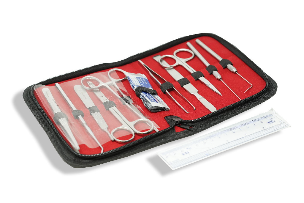 Wide variety of VWR® student dissection kits that suit educational needs., Classroom and research dissecting applications., 08_Certifications: ISO, GMP, 11_Delivery: Includes black zippered case with velvet liner, 4-¹/₂" straight iris scissors; 5-¹/₂" sharp/blunt operating scissors; 4-¹/₂" straight forceps (medium serrated tips, serrated grip with guide pin); 4-¹/₂" straight 1×2 teeth tissue forceps; 5-¹/₂" stainless steel Kelly haemostat (curved); #3 scalpel handle; #10 scalpel blades (pk 10); 65" cartilage knife (2" cutting edge); stainless steel mall-probe and seeker (hexagon 3³/₄" handle; 2¹/₂" seeker); straight teasing needle with 325" steel adjustable chuck holder; bent teasing needle with 325" steel adjustable chuck holder; 6"" hard plastic ruler., Wide variety of VWR® student dissection kits that suit educational needs., Classroom and research dissecting applications., 08_Certifications: ISO, GMP, 11_Delivery: Includes black zippered case with velvet liner, 4-¹/₂" straight iris scissors; 5-¹/₂" sharp/blunt operating scissors; 4-¹/₂" straight forceps (medium serrated tips, serrated grip with guide pin); 4-¹/₂" straight 1×2 teeth tissue forceps; 5-¹/₂" stainless steel Kelly haemostat (curved); #3 scalpel handle; #10 scalpel blades (pk 10); 65" cartilage knife (2" cutting edge); stainless steel mall-probe and seeker (hexagon 3³/₄" handle; 2¹/₂" seeker); straight teasing needle with 325" steel adjustable chuck holder; bent teasing needle with 325" steel adjustable chuck holder; 6"" hard plastic ruler., Dissection kit, Cat. No.: 76457-534