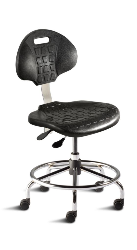 ToughTech* Polyurethane Chairs with Chrome-Plated Finish^ Stain resistant. Seats, backrests padded with ventilation ribs. Lumbar support. Backrest tilt and height adjustment, pneumatic seat height adjustment, soft wheel, ball bearing casters for hard floors. Desk height 40.6-53.3cm. 15.5kg.