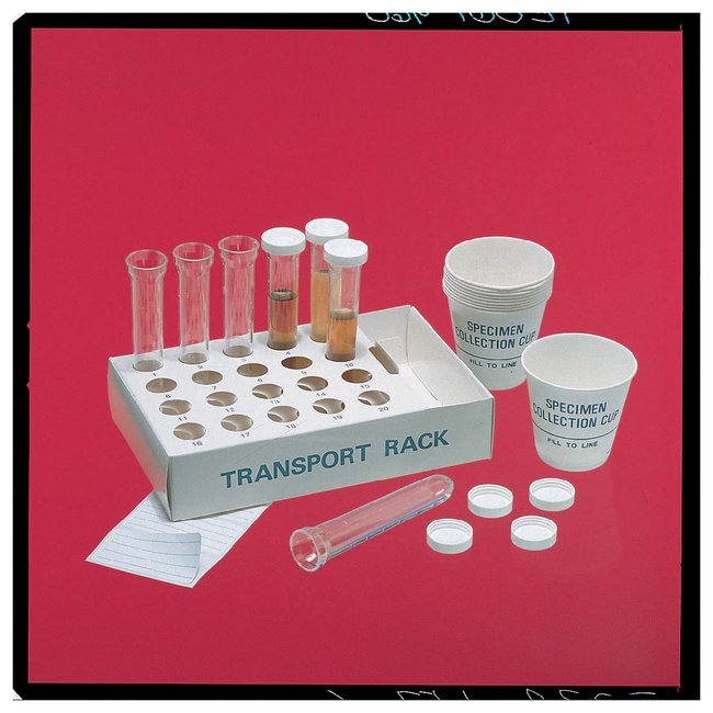 All componenets are disposable for convenient collection, delivery and testing of urine specimensPressure-sensitive patient identification labels have ample writing spaceSmall, lightweight, easy-to-carry transport rack provides space for up to 20 tubes, labels and capsSturdy polystyrene tubes are centrifuge-safeTubes flare at the top to allow use of midget urinometer and ensure tight cap fitOrder InfoTubes are available separately