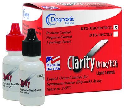 Clarity Urine/HCG Control, 1 Set X15mL^ Liquid, 2 Level, urine controls for Semi Quantitative Assay, and qualitative hCG. Easy dispensing dropper bottles. Use with Clarity Urocheck or other Urinalysis strips for Manual or Automated read. Stable liquid. Includes Creat and mAlb values. DTG-UHCTLS