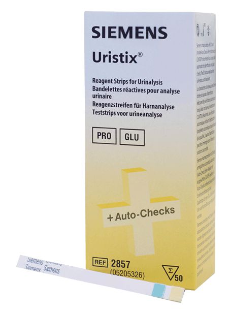 Reagent Strip^ Uristix* 4 Reagent Strip are used for urinalysis testing. Firm plastic strips, disposable. Each strip tests for four important markers, glucose, nitrite, leukocytes and protein. CLIA waived, Store in bottle, ready to use