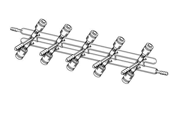This manifold is for connecting inert gas and vacuum sources. Supplied with 4 mm PTFE vacuum valves for grease-free operation, fabricated from larger 3/4” medium wall tubing, Upper left and lower right beams are open, Ports are spaced 100 mm apart and have serrated hose connections, Rod braces are located between each bank for added strength, Valves are sealed at a 45° angle to allow easier manipulation