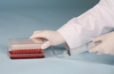 Vaccu-Pette/96* Pipetting Device^ Sterile, disposable. Harvest 25 to 300uL from 96 wells, by connecting a 35mL plastic syringe. Made of modified polystyrene transparent resin. Tray: 12.7Lx8.6Wx3.7H cm. Vacuum outlet. Each of the 96 tips holds 15uL. Has a 7.6cm piece of 3.2mm tubing. In sealed pack.