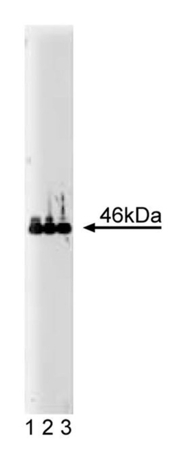 Vasodilator-stimulated phosphoprotein (VASP), a substrate for cAMP- and cGMP-dependent kinases, is associated with actin filaments, focal adhesions, and dynamic membrane regions. VASP is composed of several distinct domains: a central L-proline-rich domain contains a GPPPPP motif as a single copy and as a three-fold tandem repeat, as well as three conserved phosphorylation sites for cyclic nucleotide-dependent protein kinases (Ser157, Ser239, and Thr278). A C-terminal domain contains a repetitive mixed-charge cluster which is predicted to form an α-helix. The C-terminal domain appears to be responsible for anchoring at focal adhesion sites. VASP has been shown to be a ligand for profilins. Profilins bind to the poly-L-proline motifs of VASP and it is postulated that these two molecules act in concert to convey signal transduction to actin filament formation.Immunofluorescence, Immunoprecipitation, Western Blotting