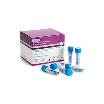 VERIFY™ Dual Species Self-Contained Biological Indicators (SCBIs) are for use in monitoring steam sterilization and ethylene oxide (EO) sterilization processes. Each SCBI is completely self contained within a vial and contains a disc inoculated with dual species bacterial spores (Geobacillus stearothermophilus and Bacillus atrophaeus) and an ampoule of specially formulated soybean casein digest growth medium with a pH indicator. The vial label contains a process indicator for steam and EO.24-hour final results for steam sterilization48-hour final results for EO sterilizationSturdy design prevents premature activationFor routine monitoring, qualification and release of loads containing implantable device