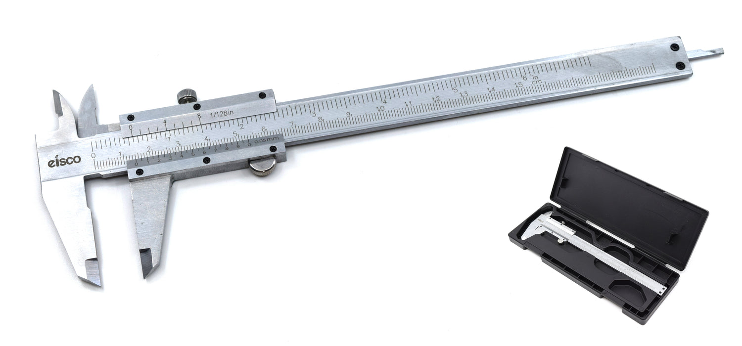 This 6 inch Vernier caliper is excellent for providing accurate and precise measurements. It features a dual scale with metric and imperial measurements, with accuracy up to 0.05mm and 1/128 inches. It is perfect for measuring the length, inner diameter, outer diameter of any objects up to 6 inches. This caliper is made from durable carbon steel, and the laser engraved graduations will not fade over time. Scientific conversions are conveniently provided on the back including The jaws glide smoothly and a locking screw can be used for obtaining measurements. Case is included.