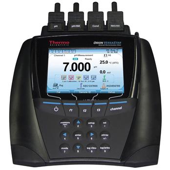 Specifications Get high accuracy, premium performance and ultimate flexibility with the Thermo Scientific™ Orion™ Versa Star PRO Benchtop Meter with pH Module. Meet your most challenging applications for pH, mV, ORP and temperature. Easily view measurements on the stunning color display and customize the four meter channels with interchangeable modules. Perform up to a six point pH calibration, log up to 2000 data point sets with time / date stamp and easily transfer calibration and data logs via USB or RS232 to a printer or computer. Use the included electrode stand to easily place sensors in samples.Onscreen measurement stability indicator lets you know exactly when your measurements are readySelectable read modes include Auto-Read to hold a stable reading, Continuous to show changing readings, Timed to log data at specific intervals and Single-Shot to hold a reading after a specific wait time is reachedAudible alarms automatically notify you when a set offset value, high/low limit value, and calibration time interval are reachedEasily access, update and switch your preferred measurement settings, using ten password-protected methods per channelUniformly mix solutions using up to two meter-controlled stirrer probes that are easy to position and can be quickly rinsed between samplesData log collects and date/time stamps up to 2,000 measurement sets with optional electrode ID, sample ID and user IDCalibration log stores ten most recent calibrations per parameter with viewable graph for multipoint pH and ISE calibrationsEnsure measurement integrity by viewing the active calibration log while taking readingsNon-volatile meter memory preserves data and settings, even in the event of power lossOrion Star Com software facilitates data transfers to a computer via USB or RS232 connectionsIP54-rated housing resists dust and splashes and can be wall-mounted if table space is limitedMeters include CE, TUV 3-in-1 and FCC Class A certifications and 3-year replacement warrantyIncludes Orion Versa Star PRO pH Measurement Module:Measure pH, mV, relative mV or ORP with temperaturePerform up to a six point pH calibration using automatic buffer recognition of NIST, DIN or user-defined buffer groups with choice to manually enter custom buffer valuesCalibration editing option allows individual points to be fixed without a full recalibrationCustomize measurements to show calibration history and pH electrode condition or simplify to show an extra large pH readingSpecificationsInputs/OutputsInputsDepends on modules selectedData Management2000 points with date/time stampOutputRS-232, USBDisplayColor, graphic LCD; user-customizable displayEnvironmental Operating ConditionsManufacturer Warranty Period3-year meter replacement