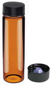 Amber glass screw thread sample vials, Packaged in corrugated trays with partitions, closed-top black phenolic closures with cone-shaped polyethylene liners, attached
