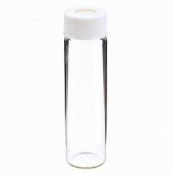 EPA Vial^ KG-33 clear borosilicate glass. 20ml. For collection and storage of water samples. 0.12mm PTFE-faced 3.0mm silicone rubber septa with open-top screw-caps attached. ODxLength: 28x60mm. GPI thread finish: 24-400. Packed in shrink-wrapped modules. Complies with EPA Methods 601-604.