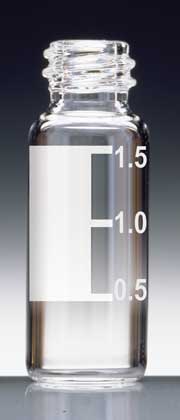 Clear glass autosampler vials, available in a variety of standard sizes and finishes, Packed 100 per tray, Vials with large opening and/or marking spot available, Closures not included