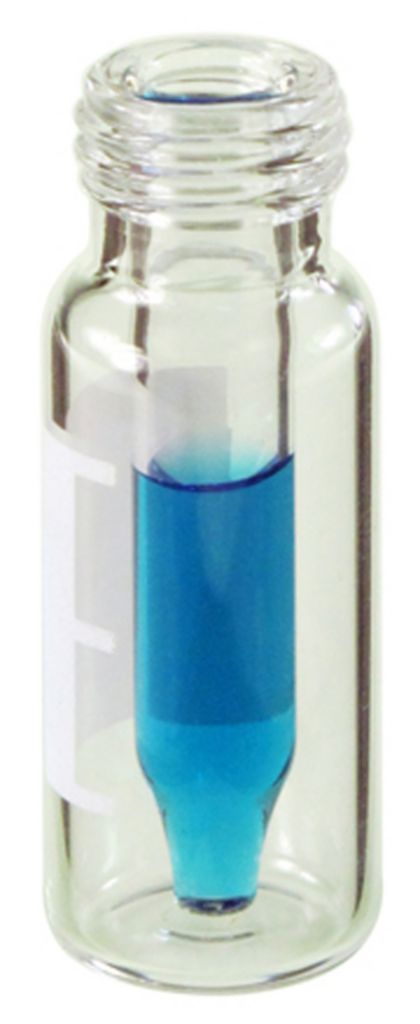 Vials, autosampler^ Clear write on, screw top with 9-425mm threads, w/ wide tip fused insert 300ul, 12x32mm. Borosilicate glass. AQbrand. 100/pack.