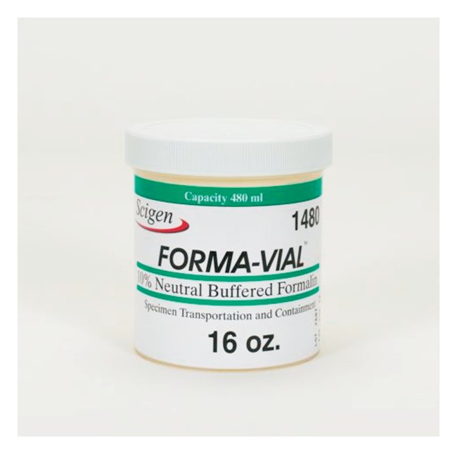 Safely transport, store and retrieve pathology specimens using Scigen’s Forma-Vial™ system. Containers from 7 mL to 7.5 Liters, filled with 10% neutral buffered formalin, OSHA compliant.