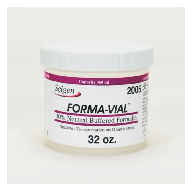 Safely transport, store and retrieve pathology specimens using Scigen’s Forma-Vial™ system. Containers from 7 mL to 7.5 Liters, filled with 10% neutral buffered formalin, OSHA compliant.