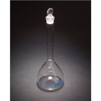 Durable, machine-blown body. Heavy beaded tubing neck. Flasks feature a sharp graduation line and large white block letters. A ground glass stopper is included. Meets Class A specifications per ASTM E-288. Batch certified.