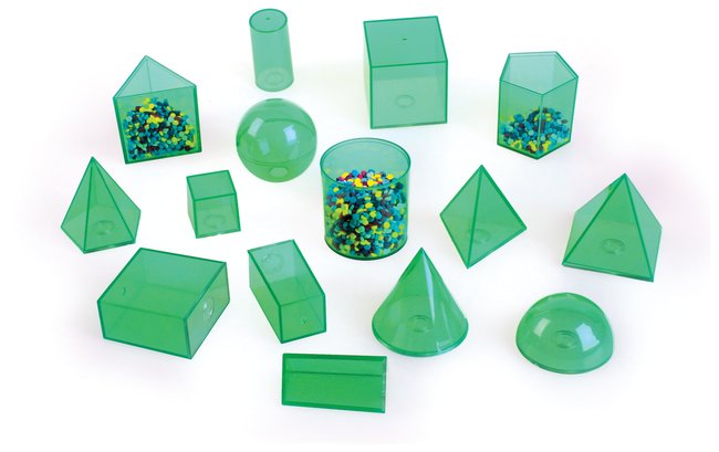 Volumetric Solids Set and Teacher Guide, Ideal tools for exploring shaps, sizes, and the relationships between area and volume, Each
