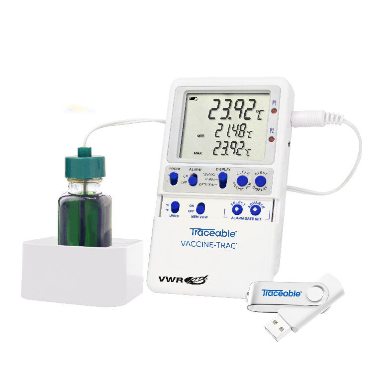 Resolution: 0.01 °C, Data Memory: 525,600 (rolling memory), Meets all CDC recommendations for VFC digital data loggers., Easily monitor temperatures overnight or for any time period. Minimum and maximum temperatures are stored until the memory is cleared. This unique data logging bundle conforms to all CDC recommendations for vaccine storage and handling. (For more details, see the Vaccine Storage and Handling Toolkit: https://www.cdc.gov/vaccines/hcp/admin/storage/toolkit/storage-handling-toolkit.pdf)., 04_BodyText: Set high and low alarms in 1° increments; alarm sounds when temperature rises above or falls below set points. The alarm tracking feature stores data for up to 10 different alarm events detailing when the alarm state occurred, as well as when the unit returned within range. Alarm state indicator includes visual LEDs, audio alerts and flashing LCD segments., 05_BodyText: Transfer data recorded in a CSV format to any computer via a USB flash drive—no software is required. Simply clear memory after downloading data to USB drive. Data logger continues to record new data while downloading old data. Other status indicators include memory full, USB data transfer, active alarm state and low battery. One bottle probe is attached to a 3 m (10') micro cable that permits a refrigerator/freezer door to close on it., 02_BulletPoint: Focus on high-quality care while ensuring VFC compliance | Works with the TraceableLIVE® web platform to upload, manage and store reports | Digital indicator, 08_Certifications: NIST-traceable certificate with data from our A2LA accredited (1750.01) calibration laboratory., 11_Delivery: Vaccine-Trac data logger with bottle probe, bottle stand for optimal probe placement, USB drive for data transfer, helpful signage to make compliance easier and NIST-traceable calibration certificate with data., VWR® Traceable® Vaccine-Trac™ Data logger bundle for vaccine monitoring with alarm, minimum/maximum function and low battery indicator, Batteries: AAA Battery (2), Connectors: 1 probe channel, Display: LCD, ½" H digits, Sensor: 1 bottle probe, Cable Type: 120" micro cable, Exterior W×D×H: 2.75W×0.75D×4.25"H, Cat. No.: 76538-696, Accuracy: ±0.25 °C, Range: –50... 70 °C (–58... 158 °F), Meets all CDC recommendations for VFC digital data loggers., Easily monitor temperatures overnight or for any time period. Minimum and maximum temperatures are stored until the memory is cleared. This unique data logging bundle conforms to all CDC recommendations for vaccine storage and handling. (For more details, see the Vaccine Storage and Handling Toolkit: https://www.cdc.gov/vaccines/hcp/admin/storage/toolkit/storage-handling-toolkit.pdf)., 04_BodyText: Set high and low alarms in 1° increments; alarm sounds when temperature rises above or falls below set points. The alarm tracking feature stores data for up to 10 different alarm events detailing when the alarm state occurred, as well as when the unit returned within range. Alarm state indicator includes visual LEDs, audio alerts and flashing LCD segments., 05_BodyText: Transfer data recorded in a CSV format to any computer via a USB flash drive—no software is required. Simply clear memory after downloading data to USB drive. Data logger continues to record new data while downloading old data. Other status indicators include memory full, USB data transfer, active alarm state and low battery. One bottle probe is attached to a 3 m (10') micro cable that permits a refrigerator/freezer door to close on it., 02_BulletPoint: Focus on high-quality care while ensuring VFC compliance | Works with the TraceableLIVE® web platform to upload, manage and store reports | Digital indicator, 08_Certifications: NIST-traceable certificate with data from our A2LA accredited (1750.01) calibration laboratory., 11_Delivery: Vaccine-Trac data logger with bottle probe, bottle stand for optimal probe placement, USB drive for data transfer, helpful signage to make compliance easier and NIST-traceable calibration certificate with data.