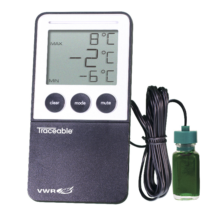 Resolution: 1 °C, No. of Channels: 1, Reliably monitor and be alerted to any issues affecting the contents of your fridge or freezer without even opening the door!, Easily monitor liquid temperature in baths and air/gas temperature in incubators, refrigerators, or freezers. Keep track of temperature conditions overnight or for any time period—the minimum and maximum temperatures are stored until the memory is cleared. Models feature a triple display that simultaneously shows current, minimum, and maximum temperatures., 04_BodyText: Set high and low alarms in 1° increments; alarm sounds when temperature rises above or falls below set points and continues to sound even if temperature returns to nonalarm range., 05_BodyText: Thermometer reads ambient temperature or external probe temperature. Probe is attached to a 3 m (10') micro-cable that permits a door to close on it; probe and cable are both submersible. Mount meter with included hook-and-loop strips, wall-mount slots, or use flip-open stand on benchtop., 02_BulletPoint: Alarm indicator lights up brightly to draw your attention to an immediate issue | Know about excursions before they happen with the pre-alert alarm light that glows orange when your fridge or freezer is within 1 degree of your alarm setting | Use the mute button to silence the buzzer alarm while you are investigating the issue | Staff onboarding is a breeze with an enhanced, more intuitive user experience including large buttons, high-contrast text, and purposeful design | Reduce upkeep with boosted battery power and interior tech upgrades for higher performance | Maintain compliance; includes NIST-traceable certificate from our A2LA accredited (1750.01) calibration laboratory | Make readings quickly and with certainty using the triple display—shows current, high, and low temperatures simultaneously | Pick the probe option that fits your application, 08_Certifications: NIST Traceable., 11_Delivery: Includes thermometer, probe, hook and loop tape, AAA batteries, quick start guide, and Traceable® certificate., VWR® Traceable® fridge/freezer digital thermometer with bottle probe, Probe Cable Length: 120", W×D×H: 0.75D×4.25" H, Display: 0.75" LCD triple-display, Probe: 0.875L×0.1875" Ø, Probe Cable Length: 3 m (9.8'), Cat. No.: 76595-160, Accuracy: ±1 °C, Probe: Bottle probe, Range: –50...70 °C (–58...158 °F), Resolution: 1 °C, No. of Channels: 1, Reliably monitor and be alerted to any issues affecting the contents of your fridge or freezer without even opening the door!, Easily monitor liquid temperature in baths and air/gas temperature in incubators, refrigerators, or freezers. Keep track of temperature conditions overnight or for any time period—the minimum and maximum temperatures are stored until the memory is cleared. Models feature a triple display that simultaneously shows current, minimum, and maximum temperatures., 04_BodyText: Set high and low alarms in 1° increments; alarm sounds when temperature rises above or falls below set points and continues to sound even if temperature returns to nonalarm range., 05_BodyText: Thermometer reads ambient temperature or external probe temperature. Probe is attached to a 3 m (10') micro-cable that permits a door to close on it; probe and cable are both submersible. Mount meter with included hook-and-loop strips, wall-mount slots, or use flip-open stand on benchtop., 02_BulletPoint: Alarm indicator lights up brightly to draw your attention to an immediate issue | Know about excursions before they happen with the pre-alert alarm light that glows orange when your fridge or freezer is within 1 degree of your alarm setting | Use the mute button to silence the buzzer alarm while you are investigating the issue | Staff onboarding is a breeze with an enhanced, more intuitive user experience including large buttons, high-contrast text, and purposeful design | Reduce upkeep with boosted battery power and interior tech upgrades for higher performance | Maintain compliance; includes NIST-traceable certificate from our A2LA accredited (1750.01) calibration laboratory | Make readings quickly and with certainty using the triple display—shows current, high, and low temperatures simultaneously | Pick the probe option that fits your application, 08_Certifications: NIST Traceable., 11_Delivery: Includes thermometer, probe, hook and loop tape, AAA batteries, quick start guide, and Traceable® certificate., VWR® Traceable® fridge/freezer digital thermometer with bullet probe, Probe Cable Length: 120", W×D×H: 0.75D×4.25" H, Display: 0.75" LCD triple-display, Probe: 0.875L×0.1875" Ø, Probe Cable Length: 3 m (9.8'), Cat. No.: 76595-162, Accuracy: ±1 °C, Probe: Bullet probe, Range: –50...70 °C (–58...158 °F), Reliably monitor and be alerted to any issues affecting the contents of your fridge or freezer without even opening the door!, Easily monitor liquid temperature in baths and air/gas temperature in incubators, refrigerators, or freezers. Keep track of temperature conditions overnight or for any time period—the minimum and maximum temperatures are stored until the memory is cleared. Models feature a triple display that simultaneously shows current, minimum, and maximum temperatures., 04_BodyText: Set high and low alarms in 1° increments; alarm sounds when temperature rises above or falls below set points and continues to sound even if temperature returns to nonalarm range., 05_BodyText: Thermometer reads ambient temperature or external probe temperature. Probe is attached to a 3 m (10') micro-cable that permits a door to close on it; probe and cable are both submersible. Mount meter with included hook-and-loop strips, wall-mount slots, or use flip-open stand on benchtop., 02_BulletPoint: Alarm indicator lights up brightly to draw your attention to an immediate issue | Know about excursions before they happen with the pre-alert alarm light that glows orange when your fridge or freezer is within 1 degree