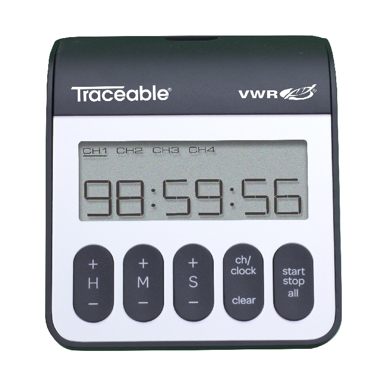 Calibrated timer and digital clock is always near-at-hand with its clip-on, magnet, and benchtop configurations with adjustable viewing angle., This timer allows you to count up to or down from 99 hours, 59 minutes, 59 seconds with 1-second resolution. This timer features a 3/4" high display with four channels that can be used simultaneously. Each channel has a distinctive alarm that sounds for 1 minute. Pressing any button will turn off the alarm. Timer memory recalls previous time set. Features time of day in 12- or 24-hour formats., 02_BulletPoint: Ergonomic design provides optimal viewing angle, easy use, and increased stability on bench | Antimicrobial protection is built in for a cleaner, more hygienic product | Large, tactile buttons are easy to use when wearing gloves | This timer steps in time with 4 channels to time multiple events at once and default digital clock function | Maintain compliance; includes NIST-traceable certificate from our A2LA accredited (1750.01) calibration laboratory | Repetitive or recurring tasks are quick and easy with on-board memory function that returns display to previously programmed countdown time | Never miss your cue with extra-loud alarms that sound for 1 full minute | LCD display, 08_Certifications: NIST Traceable., 11_Delivery: Includes timer, AAA battery, quick start guide, and Traceable® certificate., Final SAP Desc Link: 6904348, SAP Description Status: Ready, Resolution: 1 s, Calibrated timer and digital clock is always near-at-hand with its clip-on, magnet, and benchtop configurations with adjustable viewing angle., This timer allows you to count up to or down from 99 hours, 59 minutes, 59 seconds with 1-second resolution. This timer features a 3/4" high display with four channels that can be used simultaneously. Each channel has a distinctive alarm that sounds for 1 minute. Pressing any button will turn off the alarm. Timer memory recalls previous time set. Features time of day in 12- or 24-hour formats., 02_BulletPoint: Ergonomic design provides optimal viewing angle, easy use, and increased stability on bench | Antimicrobial protection is built in for a cleaner, more hygienic product | Large, tactile buttons are easy to use when wearing gloves | This timer steps in time with 4 channels to time multiple events at once and default digital clock function | Maintain compliance; includes NIST-traceable certificate from our A2LA accredited (1750.01) calibration laboratory | Repetitive or recurring tasks are quick and easy with on-board memory function that returns display to previously programmed countdown time | Never miss your cue with extra-loud alarms that sound for 1 full minute | LCD display, 08_Certifications: NIST Traceable., 11_Delivery: Includes timer, AAA battery, quick start guide, and Traceable® certificate., VWR® Traceable® four-channel timer, Cat. No.: 76595-170, W×H×D: 3×1.1×3.8", Accuracy: 0.01%, Timer: 100 h, Final SAP Desc Link: 6904348, SAP Description Status: Ready