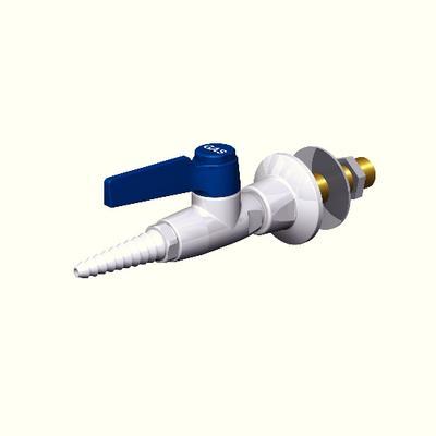 Wall Mounted Laboratory Ball Valve^ White epoxy-coated valve w/ integral straight serrated hose end. Forged brass valve body.Black nylon handle, turret base, and mounting shank. Rated for use at pressures up to 75 psi.Meets ANSI Z21.15 standard and is AGA/CGA certified.Single Flange.