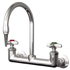 Panel Mounted Gooseneck Mixing Faucet^ Chrome-plated cast brass,serrated hose end,1.0cm(3/8in) IPS inlet shanks.Faucet valves are self-contained renewable units with replaceable stainless steel seats. CSA certified. Complies with ANSI/ASME A112.18.1M. Swing Faucet with Spread Gooseneck
