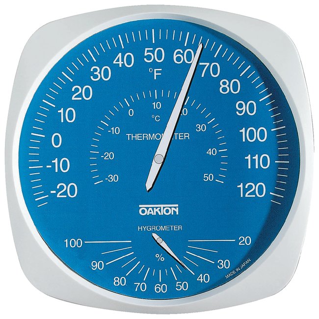 Monitor indoor room conditions (no batteries or external power required).Dual-temperature display in Fahrenheit and centigradeWhite plastic case with blue and white dial designL × dia.: 1 × 10.8 in. (2.54 × 27.3cm)Relative humidity: 20 to 100%Temperature: -30° to 40°C (-22° to 122°F)