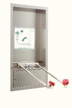 Wall Mounted Eyewash^ Wall mounted eyewash with Stainless Steel cabinet. Unit is designed to meet wheelcair accessible requirements.