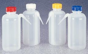 Color-Coded Unitary* Wash Bottles, LDPE^ With assorted-colored polypropylene closures (white, red, yellow, blue). Capacity: 500mL.