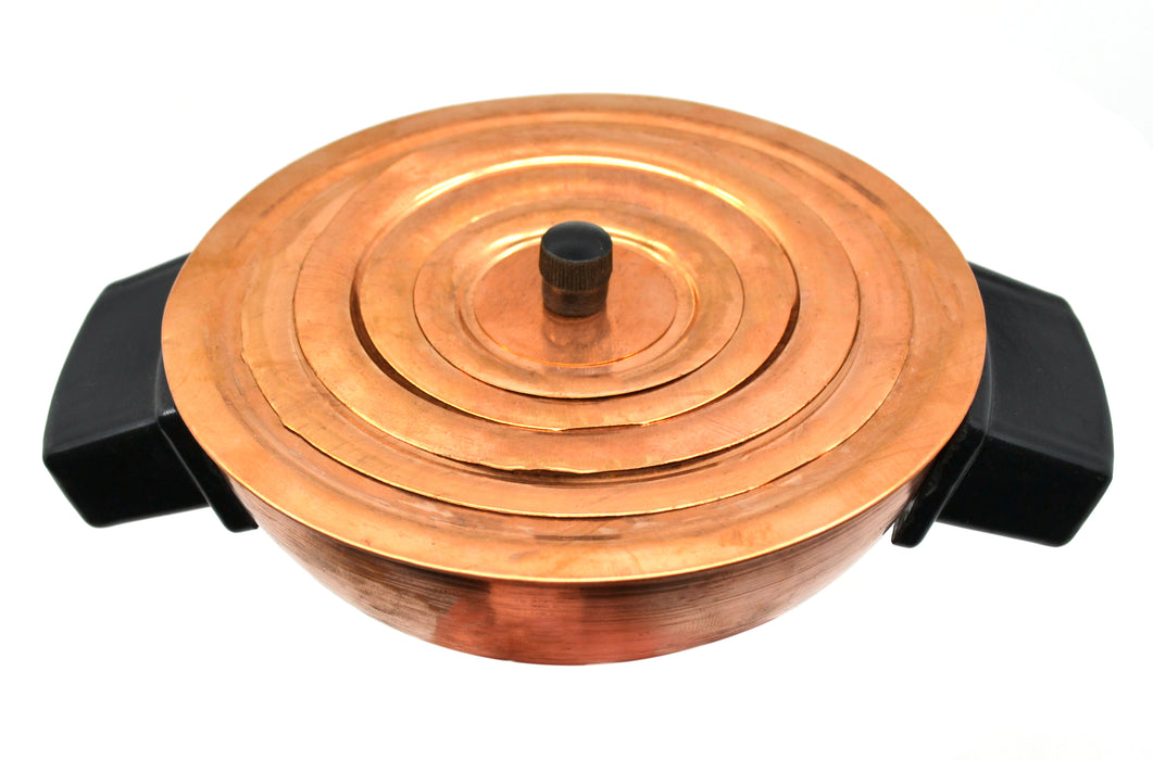 Hemispherical Water Bath made of copper sheet. 125ml capacity. The lid is comprised of a set of concentric rings. Approximately 5" diameter (125mm). Features two side handles and a top handle for safe and easy handling.