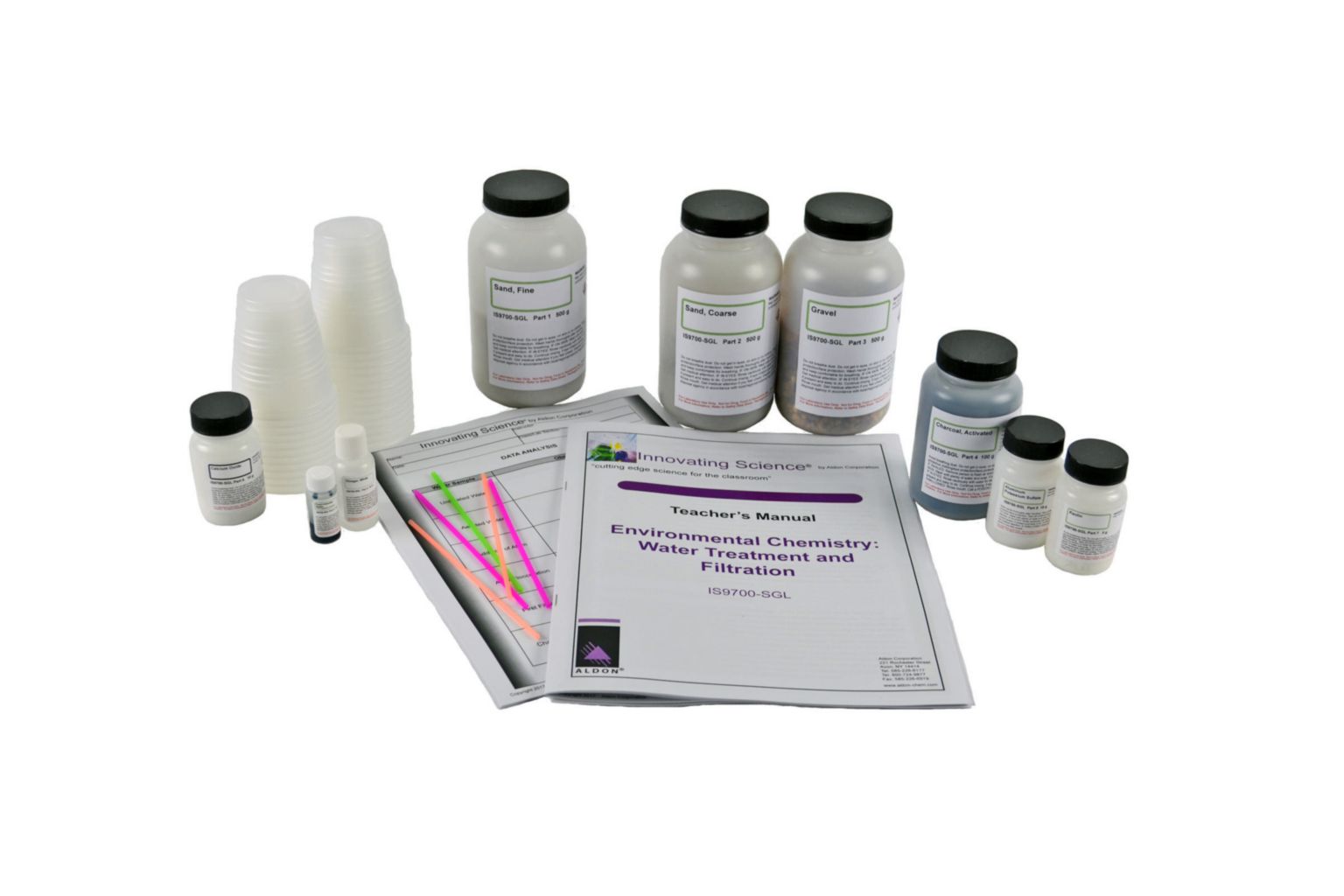 Water Treatment And Filtration Kit^ Water Treatment And Filtration, Environmental Chemistry, Includes: Fine Sand, Coarse Sand, Fine Gravel, Activated Charcoal, Alum, Lime, Green Food Coloring, Odor Agent, Plastic Cups, 5 Stirring Sticks, Used In Examining The Changes In The Water Due To Pollutio