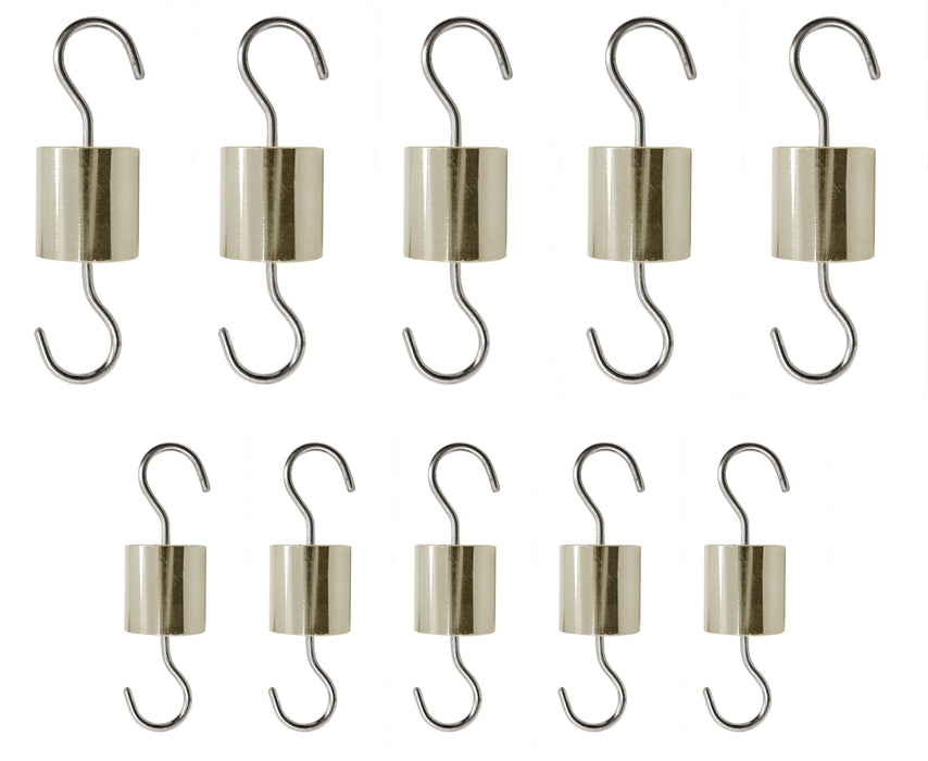Set of 10 hooked weights, made of premium quality brass. Precisely machined for accuracy. Excellent tool for physics experiments. Set includes (5) 50 gram weights, and (5) 25 gram weights. Hooks are retractable on both ends, and are perfect for hanging in tandem with other weights. Useful for a variety of physics experiments. 50g weights measure 2.5" long (including hooks), and have a diameter of 0.75". 25g weights measure 1.75" long (including hooks), and have a diameter of 0.6".