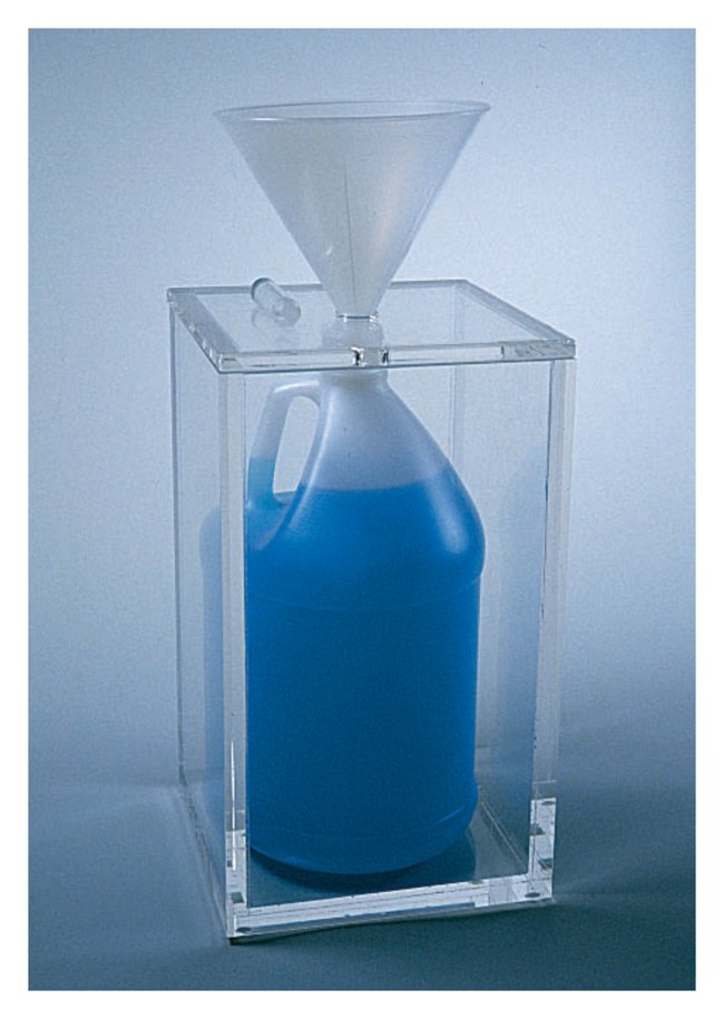 Full-gauge 0.37 in. thick (0.95cm) acrylic constructionContainer with cover accepts wide-mouth funnel for easy disposal of liquid radioactive materialExcess residue can be rinsed from funnel into jug to further reduce exposureTotally enclosed container with hinged cover is taller to accommodate both jug and funnel within its interiorAccommodate 1 gal. (3.8L) jugBoth designs feature nonskid feet