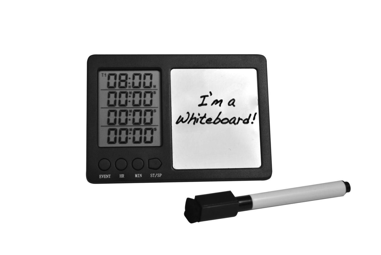 Whiteboard timer^ Whiteboard timer, Clock features count up or down to 24 hours 59 minutes, 4 channels and stands up or attaches to a magnetic surface. Whiteboard and marking pen. Makes a sound when time has expired and batteries included.