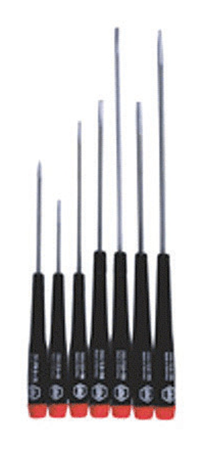Vapor hard chromed satin non-slip tipsThrough hardened for maximum durabilityAll handles are molded onto bladesSpin-free finger control capsStandard Set Includes: Slotted 2.5 x 50mm, 2.5 x 100mm, 3 x 100mm, 3 x 150mm, 4 x 100mm, 4 x 150mm; Phillips No. 0 x 75mmLong Set Includes:Slotted 1.5mm, 2.0mm, 2.5mm, 3.0mm; Phillips No. 00, No. 0, No. 1