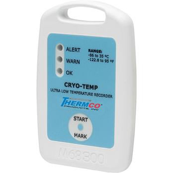 Specifications Cryo-Temp –80 Ultra Low Temperature Data Logger, records temperatures as low as – 80C. and can be used in a broad line of applications such as monitoring blood plasma, vaccines , pharmaceuticals, frozen foods and shipping containers. This standalone device does not require any additional probes. The enclosure is designed with a handle for easy attachment and is IP64 splash resistant. It utilizes a USB docking station (sold separately), to communicate with a personal computer or laptop.The Cryo-Temp –80 provides date and time stamped temperature readings and uses the Thermco Data Logging Software. The user can view the data in graphical or tabular form. High and low alarm limits and high and low warning limits can be programmed through the software. The user can set the alarm limits in the range required for the goods to be maintained. The warn limits can be set to alert the user when the temperature is nearing a high or low alarm limit, so that proper action can be taken to ensure the integrity of the goods.The Cryo-Temp –80 is equipped with three LED’s. The green LED will blink every 15 seconds while the recorder is logging data. The yellow LED will blink every 3 seconds when the temperature has breached the warning limits. The red LED will blink every 3 seconds when the temperature alarm limits have been exceeded. The Cryo-Temp –80 is the ideal temperature monitoring solution for any application involving ultra low temperature data loggingFeaturesUltra Low Operating Temperature (-86°C)May Be Placed In Direct Contact With Dry IceNo External Probes Or WiringProgrammable Alarm & Warn Ranges w/Alarm DelayLed Status Indicators For Instant Alarm NotificationHigh AccuracyMagnetic StartOptional Password ProtectionSplash Resistant (Ip64)CE CompliantTemperatureSensor:NTC ThermistorTemperature Range:-86°C to 35°C recommended, may be used up to 55°CTemperature Resolution:0.1°CCalibrated Accuracy:±1.0°CMemory:32,767 readings; software configurable memory wrapReading Rate:5 seconds to 30 minutes, selectable in softwareStart Modes:Software programmable immediate start, delay start up to 30 days in advance or manual start with magnetic switchTemperature Alarm:Software programmable high and low alarm limits, high and low warn limits each setpoint may be individually enabled or disabledAlarm Delay:Software programmable time delay for warn/alarm limits. Logger will not indicate out of range status until the temperature has been out of range for a for a set period of time.Status Indicators:Green- Blinks to indicate safe conditions during logging Yellow- Blinks to indicate warn limits have been exceeded Red- Blinks to indicate alarm criteria (limits/delay) have been exceededPassword Protection:An optional password may be programmed into the device to restrict access to configuration options. Data may be read out without the password.Calibration:Digital calibration through softwareCalibration Date:Automatically recorded within deviceBattery Type:3.6V lithium battery (LTC-7PN), factory replaceable onlyBattery Life:2 years typical @ 25°C, 1 min. reading intervals 1 year typical @ –80°C, 1 min. reading intervalsData Format:Date and time stamped ºC, ºF, K, ºRTime Accuracy:±2 minutes/month max. at 20 to 30°C ±5 minutes/month max at –80°CComputer Interface:USB docking station to PC (IFC300) 38,400 baudSoftware:XP SP3/Vista/Windows 7Operating Environment:-86°C to 35°C (may be used up to 55°C); 0 to 100% RHDimensions:3.3” x 2.1” x 0.4” (83 mm x 54 mm x 11 mm)Ingress Protection/IP:IP65 (splash resistant, not submersible)Enclosure:ABS plastic, white, polycarbonate labelingWeight:1.4 oz (40 g)
